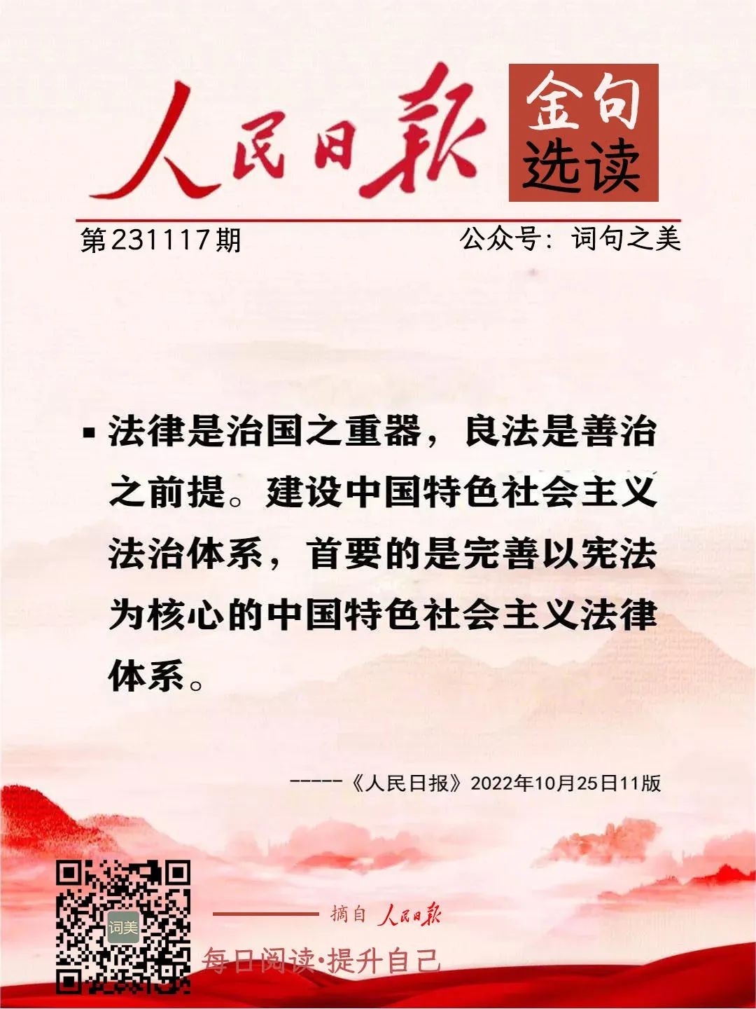 ▌法律是治国之重器,良法是善治之前提。建设中国特色社会主义法治体系,首要的是完善以宪法为核心的中国特色社会主义法律体系。一一《人民日报》2022年10月25日11版