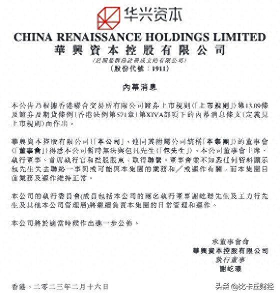 2月16日晚,华兴资本公告称,暂时无法与控股股东包凡取得联系。