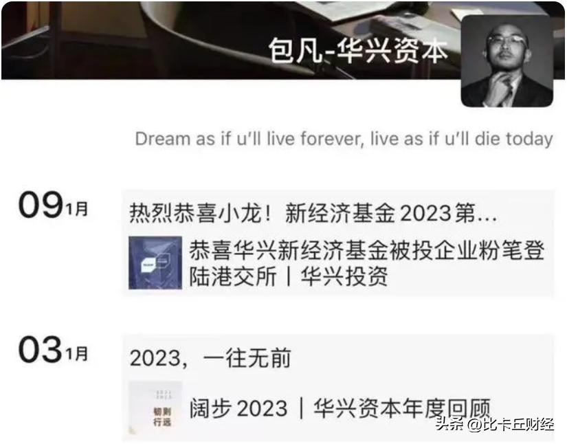 有媒体翻出了包凡的微信朋友圈,发现其在2023年只更新过两次:一次是在1月3日,他转发了华兴资本的年度回顾,并写道“2023,一往无前”;第二次是在1月9日,华兴新经济基金投资的企业——粉笔网登陆港交所,包凡对该公司的上市表达了祝贺。
