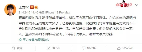 王力宏发文称和妻子李靓蕾的私生活很简单,很单纯,林林总总说了一通,但结论只有一个:两个人的婚姻走到了尽头,虽然还没正式离婚,但已经提出了离婚的申请。