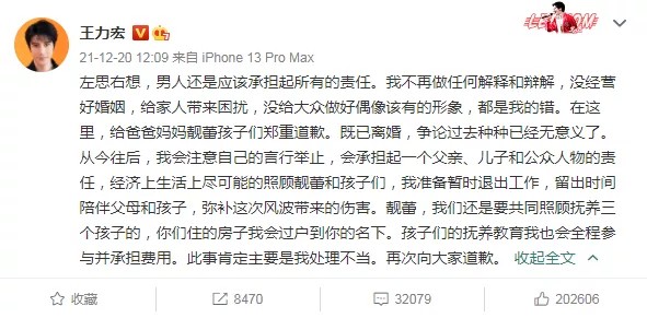 可出人意料的是,王力宏前脚才官宣离婚,后脚妻子李靓蕾就发长文,戳穿了王力宏的种种谎言,网友才发现:王力宏的私生活才没他说的那样单纯简单。