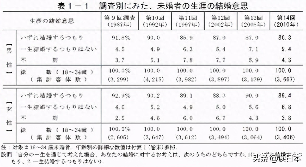 据日本人口问题研究所调查,自1987年以来,明确表示不会结婚的年轻人一直在增加。截至2010年,有9.4%的男性选择不结婚,女性比例也占到6.8%。而且,这一数字还在持续上升。