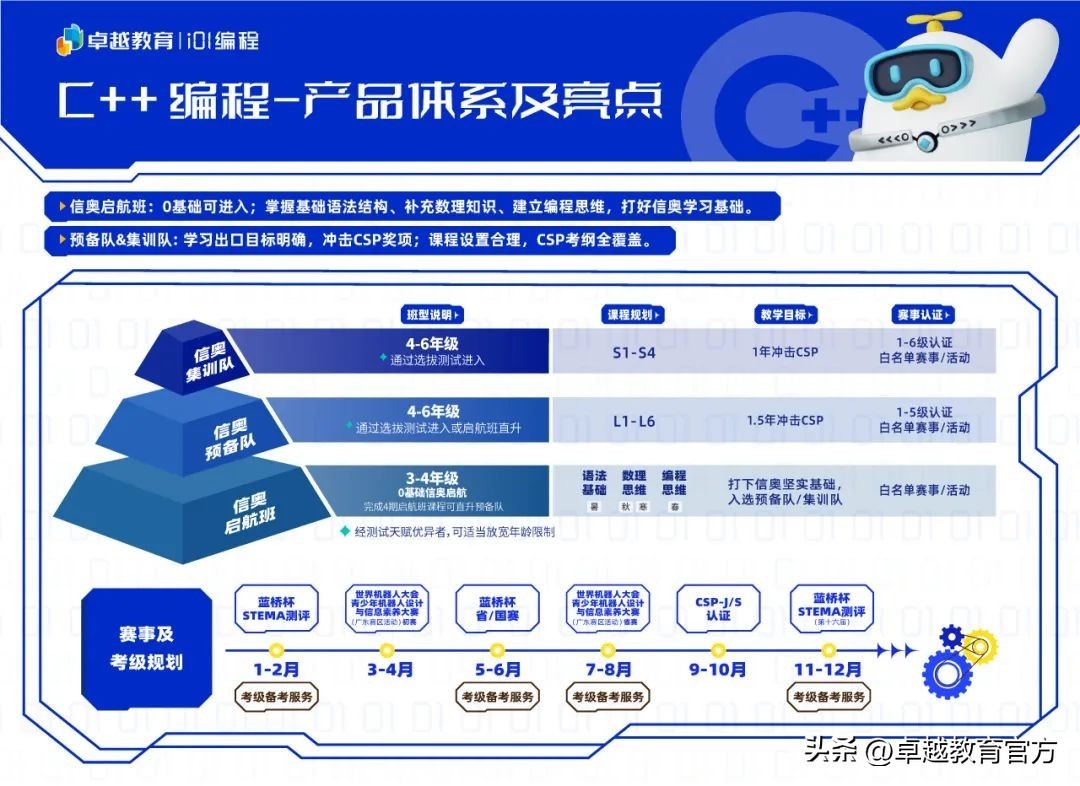 为了兼顾不同基础的学员,卓越i01编程规划了一条完整的、课程设置合理的C++学习路线。