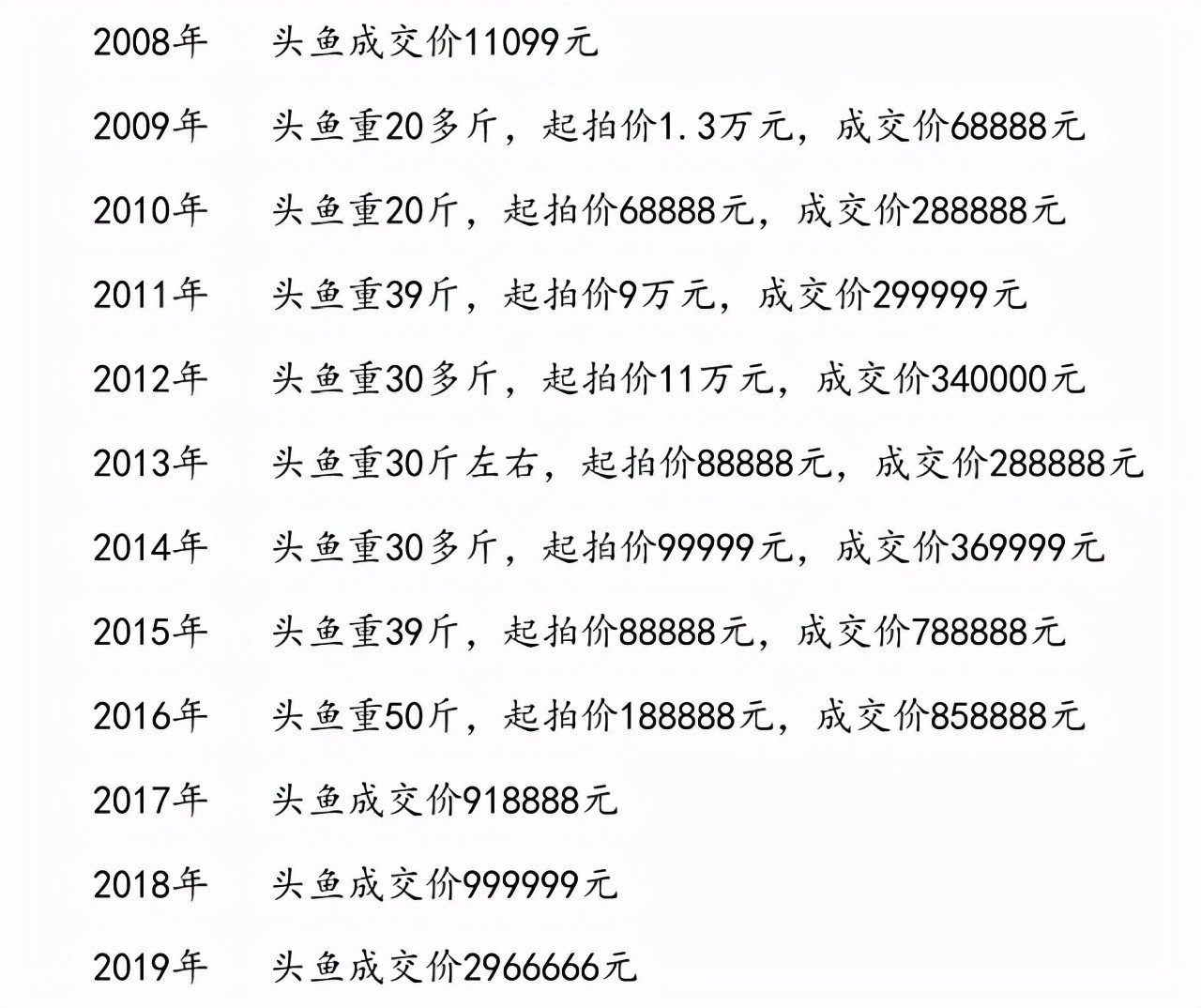 从几十万到如今的连续2999999万,近300万。细算一下,一斤鱼肉高达了8万元左右。20年间头鱼身价翻了3000倍,为何会卖得这么贵?它又“贵”在了哪里?