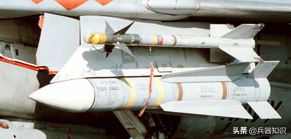 ▲ 挂在F-14战斗机挂架下的AIM-54“不死鸟”空空导弹(下)和AIM-9空空导弹