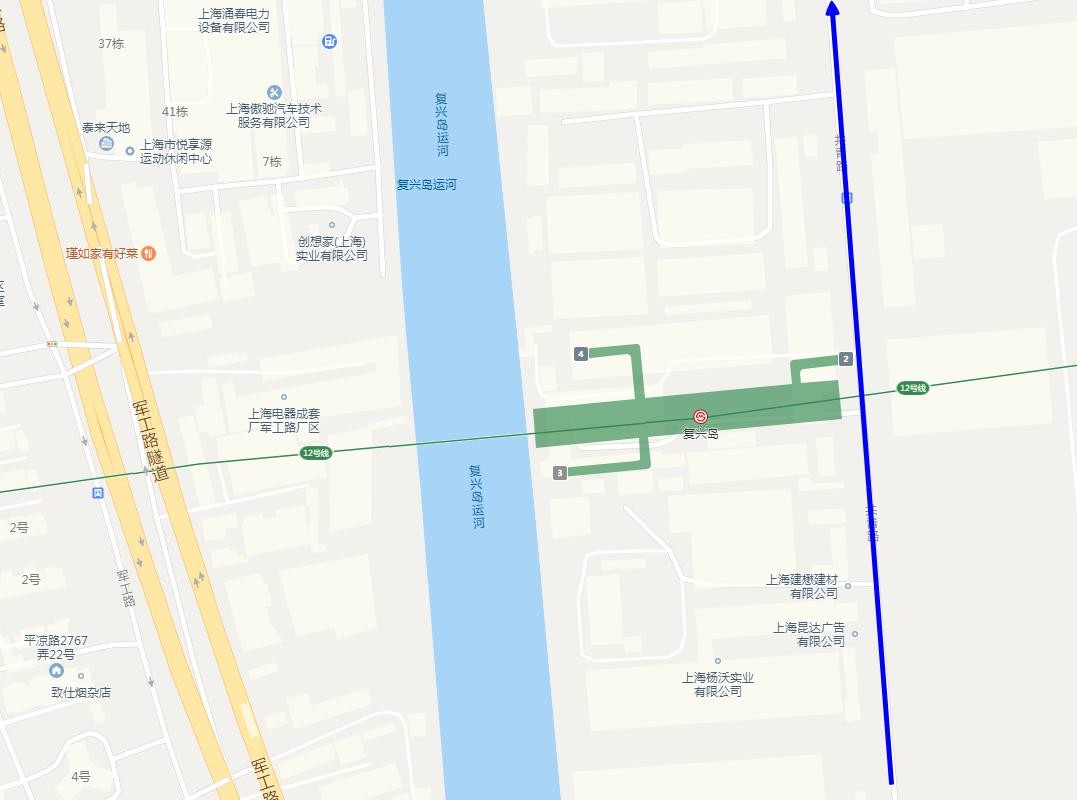 图中蓝线就是上海市复兴岛上面的共青路,上海地铁12号线的复兴岛站的2号出口位于这条路上面,而上海地铁12号线的3号口和4号口都位于站点的西侧,也就是靠近黄浦江的位置。