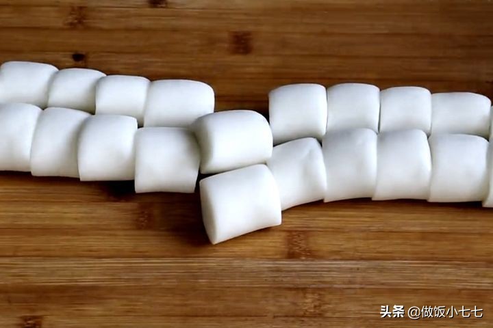第三步:准备澄粉300克、土豆淀粉120克、食盐2克搅拌均匀,再加上开水420毫升,搅拌到没有干面粉,再加上食用油20毫升,下手揉成一个面团,把面团的表面揉光滑,分成小剂子。