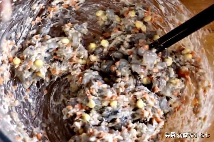 2:下面开始调馅料,在虾肉里加上猪肉馅,这样可以使馅料口感更加的暄软劲道,不发干,再加上玉米粒、胡萝卜、食盐、胡椒粉等调料调味即可。