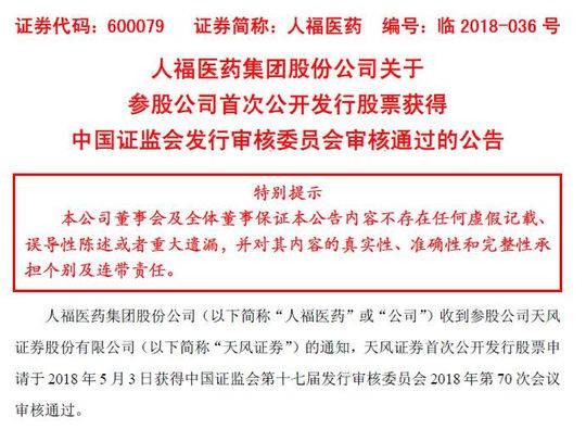 5月3日晚间,人福医药公告称,天风证券首次公开发行股票申请于5月3日获得证监会审核通过。截至目前,公司直接及间接持有的天风证券股份合计为6.25亿股,占天风证券发行前总股本的13.40%。