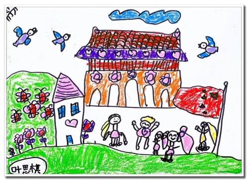 这是本期选登封面的作品,皓轩作品构图很棒!用简洁的块面绘画长城,人物表情生动有趣,透过绘画几位小朋友手舞足蹈的欢乐喜庆场景及平鸽子与气球,描绘出五彩缤纷的节日气氛,国庆节不仅仅是一种形式,它更是一种象征,时刻提酲我们不要忘记自己的祖国。