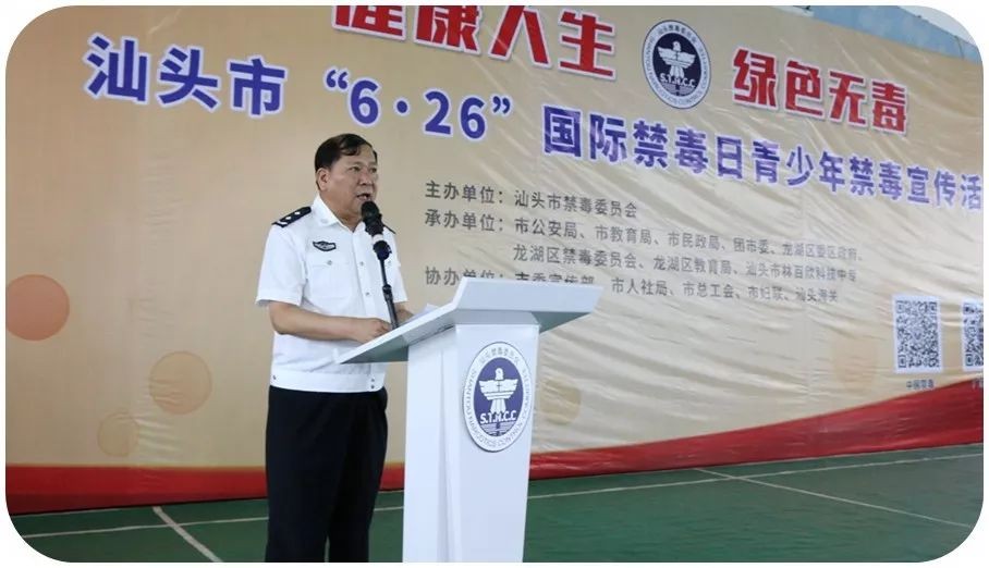 上午8时整,活动在庄严的国歌中拉开帷幕。曾湘澜同志作了重要讲话,肯定了汕头市毒情形势出现“四减少两上升”的积极变化。同时强调,禁毒工作仍然任重道远,需要各级各部门齐抓共管、社会各界广泛参与。他号召大家携起手来,共筑禁毒长城,为青少年创建一个“健康人生,绿色无毒”的社会环境,为把汕头打造成为活力特区、和美侨乡、粤东明珠作出新的更大贡献!