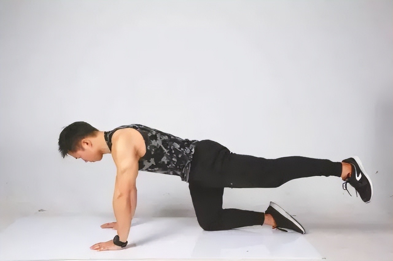 1.身体呈四足跪姿,手掌支撑在肩膀前方呈向前推,膝盖跪在臀部下方。
