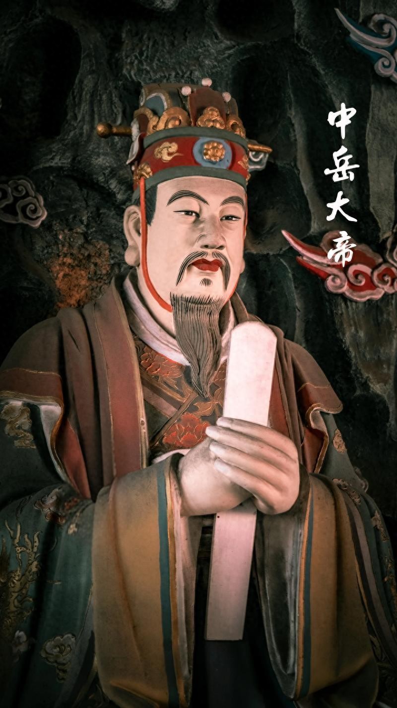 所以,咱们认为的位居中央的老大哥,其实比其他四位,反而出现的时间要晚不少。说回中岳大帝,他是嵩山之神,全称叫中天大宁崇圣帝。据《云笈七签》卷七称:“中岳嵩高君,领仙官玉女三万人,服黄素之袍,戴黄玉太乙之冠,佩神宗阳和之印,乘黄龙,从群官。”