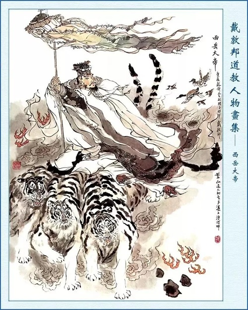 西岳大帝:西岳华山金天顺圣大帝、金天王、金天顺圣帝、西岳金天大利顺圣上帝、太无虚极司梵真君、华林纪算天尊、华山神、素元耀魄大明真君。姓蒋名雄(一说姓皓名郁狩)。居住在素元天宫(西岳太华宫)。坐骑为乌骓马。兵器为五爪烂银抓。
