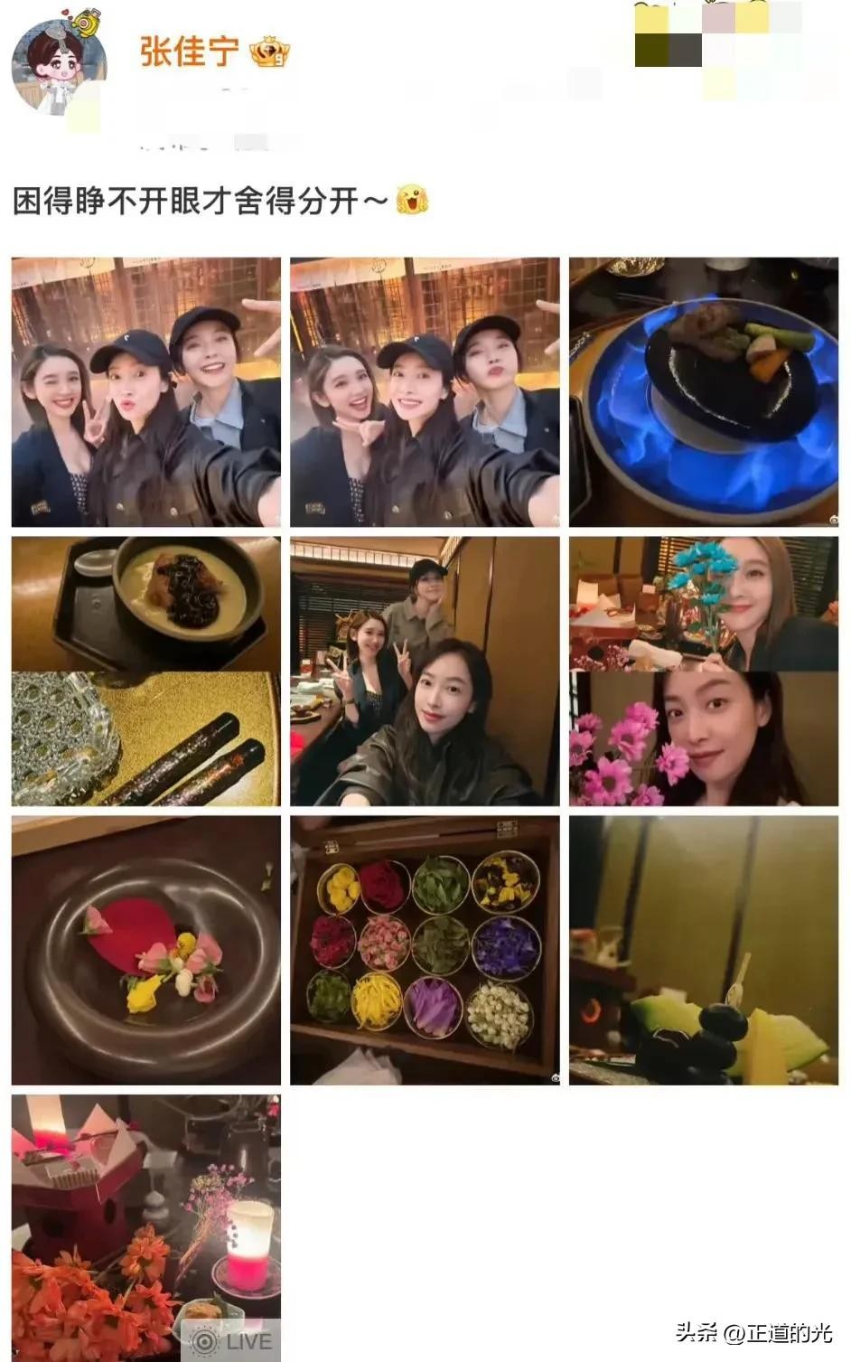 唐艺昕和张佳宁在社交平台上晒出与宋茜三人闺蜜团聚会的照片,三人喝花茶,吃牛排和帝王蟹,一起品昂贵的红酒超阔气。