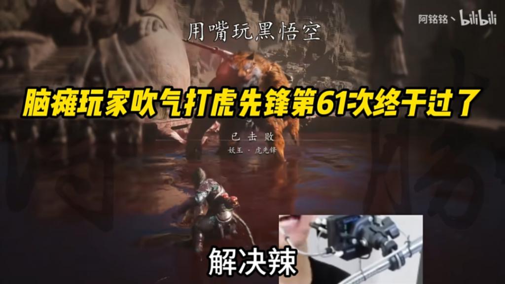 在惊叹 " 牛逼 " 之余,这也让我联想起,全盲 UP 主诺子喵呜,靠听声辨位 + 弹幕指挥,打过《黑神话:悟空》第一个 BOSS 的情景;还有脑瘫 UP 主阿铭铭丶,用嘴吹着气打过虎先锋……