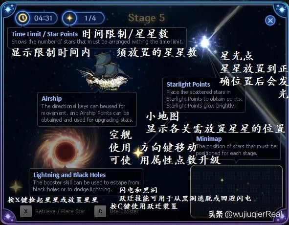这是九周年庆第一弹的小游戏活动。您需要开一条小船在限定的时间内收集星星,并放置到正确的位置拼接成一个完整的星座。按X键捡起星星或放置星星,按C键使用跃迁装置(跃迁技能可用于从黑洞逃脱或回避闪电)。界面右下方有雷达可查看。
