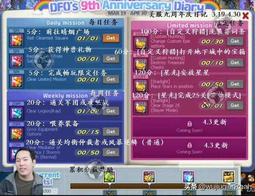 完成活动任务可以收集活动分数(另外一个,和九周年庆日记的分数不共享),每次活动分数达成100分后可以领取分数达成礼盒(浓缩雾核1000个,精致迷雾250个,装备修理券[所有部位]2个,装备属性成长券10个),可以重复达成并领取。