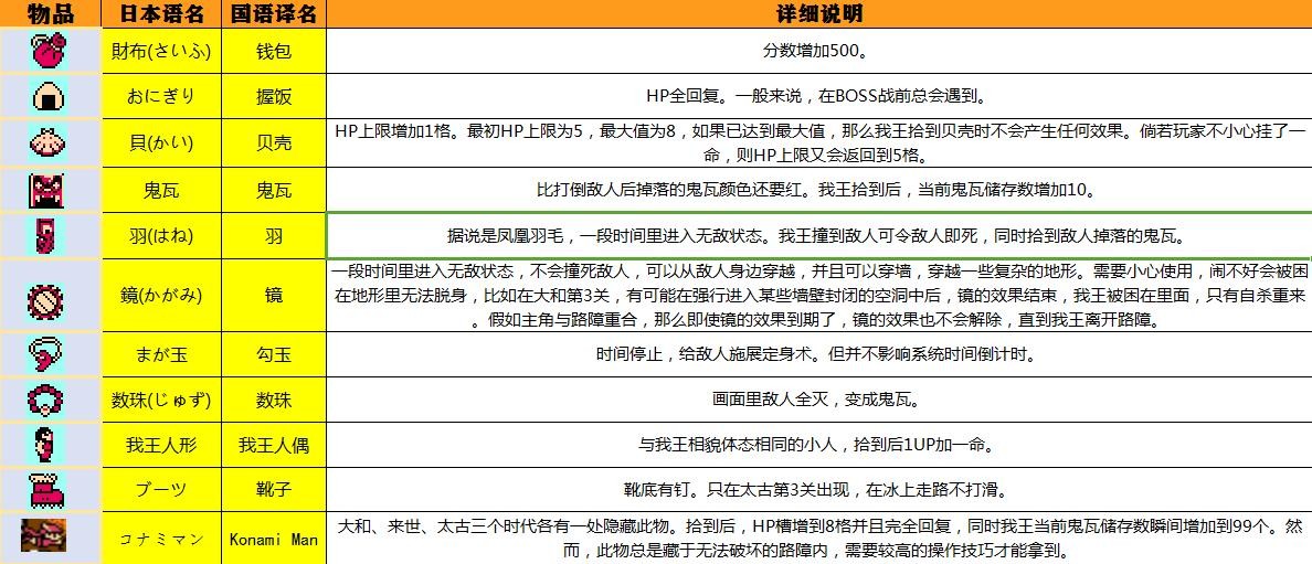 一般来说,物品是从宝箱里打出来的,有时候,打倒敌人也会低概率掉落物品,虽然一般情况下敌人总是掉落鬼瓦。甚至有时候,敌人掉落鬼瓦后,我王的飞凿击中鬼瓦,鬼瓦竟然变成了某种物品。