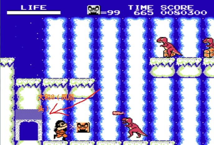 当年我在FC主机上玩的时候,只剩下最后一个火鸟雕刻图破片拿不到,后来在模拟器上复习,仍然是拿不到。请教老司机才明白,蹲下跳起可以砸破脚下的地形,太古3某个怨念的冰洞终于可以进入了,如此我才终于进入了隐藏的大和8拿到了最后一个火鸟雕刻图破片。
