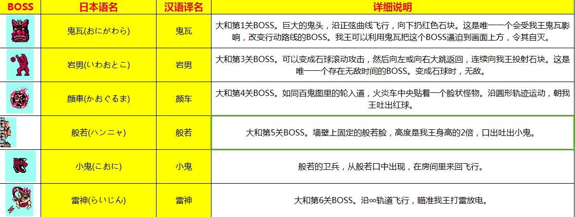 大和5一开始从空中落下的宝箱要注意点射击中,吃到其中一个宝箱中的握饭,这很重要,因为这一关敌人难缠且握饭难找。最后一段路,上层很多佛像,下层是空的,建议走下面,上面危险,如果一次性登场的秃头盗贼太多,就会因为FC机能原因导致画面变慢,主角变得不好操作,陷入苦境,很容易挂。BOSS战,般若,先用鬼瓦封住下面,然后跳到上面找机会打杂鱼,等杂鱼变成鬼瓦铺满两层后,从上面向前铺设鬼瓦突破,以落下瞬间铺设鬼瓦站在空中的突破方式,直到靠近BOSS的额头,用子弹猛轰。最快最省事的办法是从BOSS下巴右边附近破坏建材向上突破,铺设鬼瓦跳上去,跑到BOSS下巴下方对着上方的BOSS猛轰。