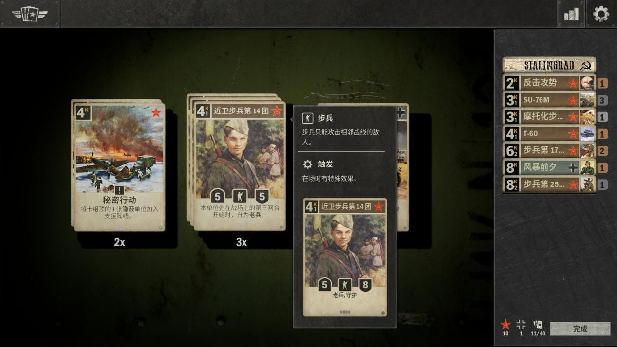 拥有老兵字段的卡牌,会在完成特定条件后得到一次进阶。比如,苏联近卫步兵第14团在生存三回合后,就会从10点身材升级为13点身材,并获得守护字段。