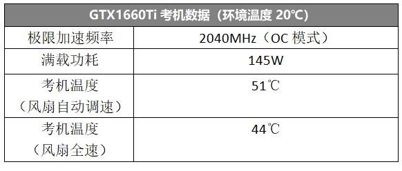 从实测来看,即便是风扇自动调速这种相当静音的模式,GPU的考机温度也仅有51℃,而风扇全速的情况下,更是只有44℃。满载情况下,GTX1660Ti的功耗也只有145W,可见按照120W的TDP来搭配散热器是没问题的。
