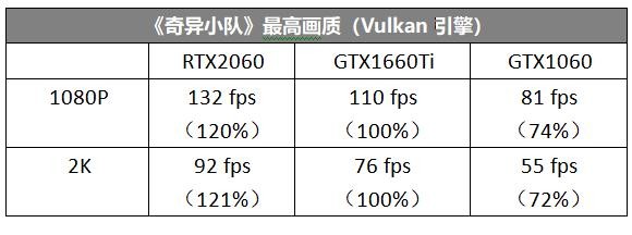 《奇异小队》支持Vulkan API,硬件要求比较低一些。从实测情况来看,GTX1660Ti在1080P最高画质下轻松达到了110fps的帧速,在2K分辨率下也能达到76fps,这都是超越60fps的电竞级帧速,相比GTX1060优势很明显。此外,GTX1660Ti与RTX2060的性能差异也比GTX1660Ti与GTX1060的性能差异小。