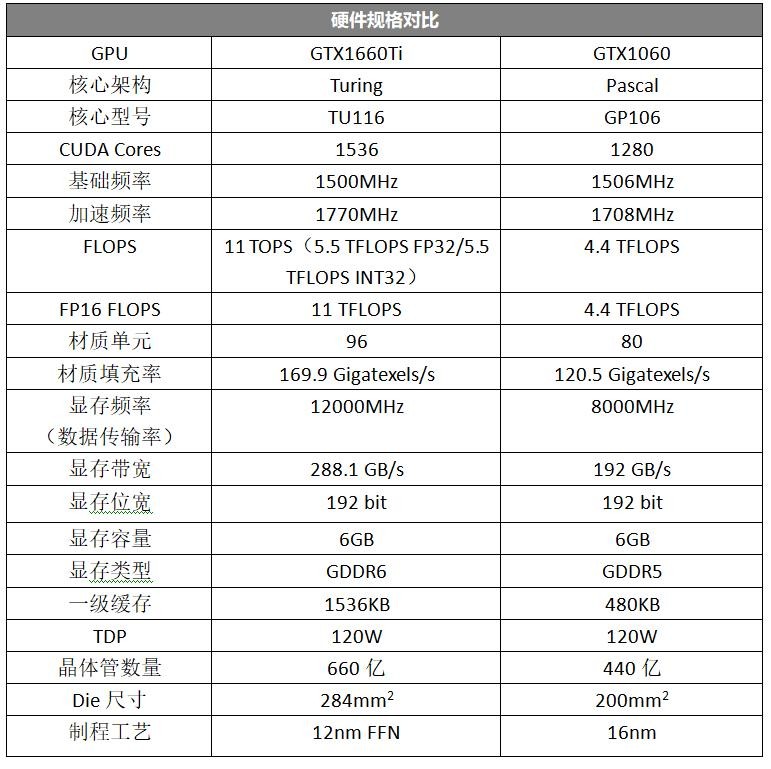 从NVIDIA官方提供的规格参数来看,GTX1660Ti大幅提升了运算能力,TOPs、FP16 FLOPs都达到了GTX1060的2倍,一级缓存也是GTX1060的3倍。同时它的CUDA单元也提升到了1536个,相比GTX1060的1280个提升了不少,材质单元也达到了96个,比GTX1060多出16个,加速频率也有一定的提升。