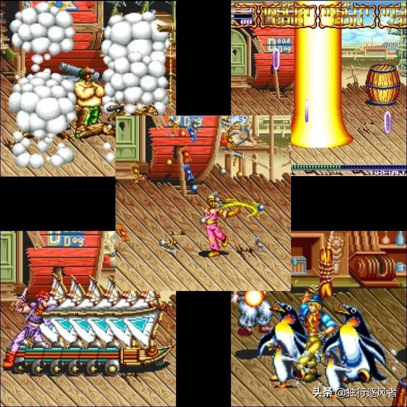 这款游戏在街机里最大的乐趣就是可以四个人玩,好爽。孙悟空比较多人选,白龙马也不错,他们的属性大招至今都还记得,凸木功、天宫火、地道功、冰火掌、无影刀,还有宝物系统以及合体技能,过关抢东西吃,积累的武器留着干大BOSS。