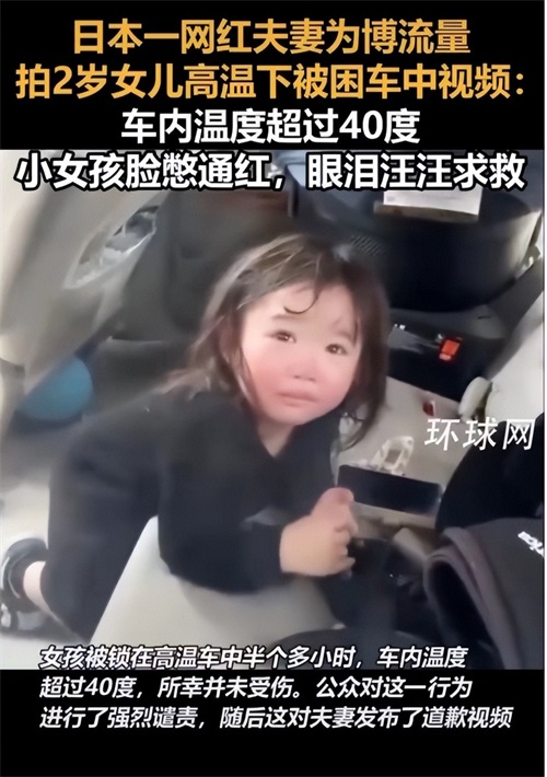 日本一网红夫妻为博流量,把2岁女儿放在车内拍视频。
