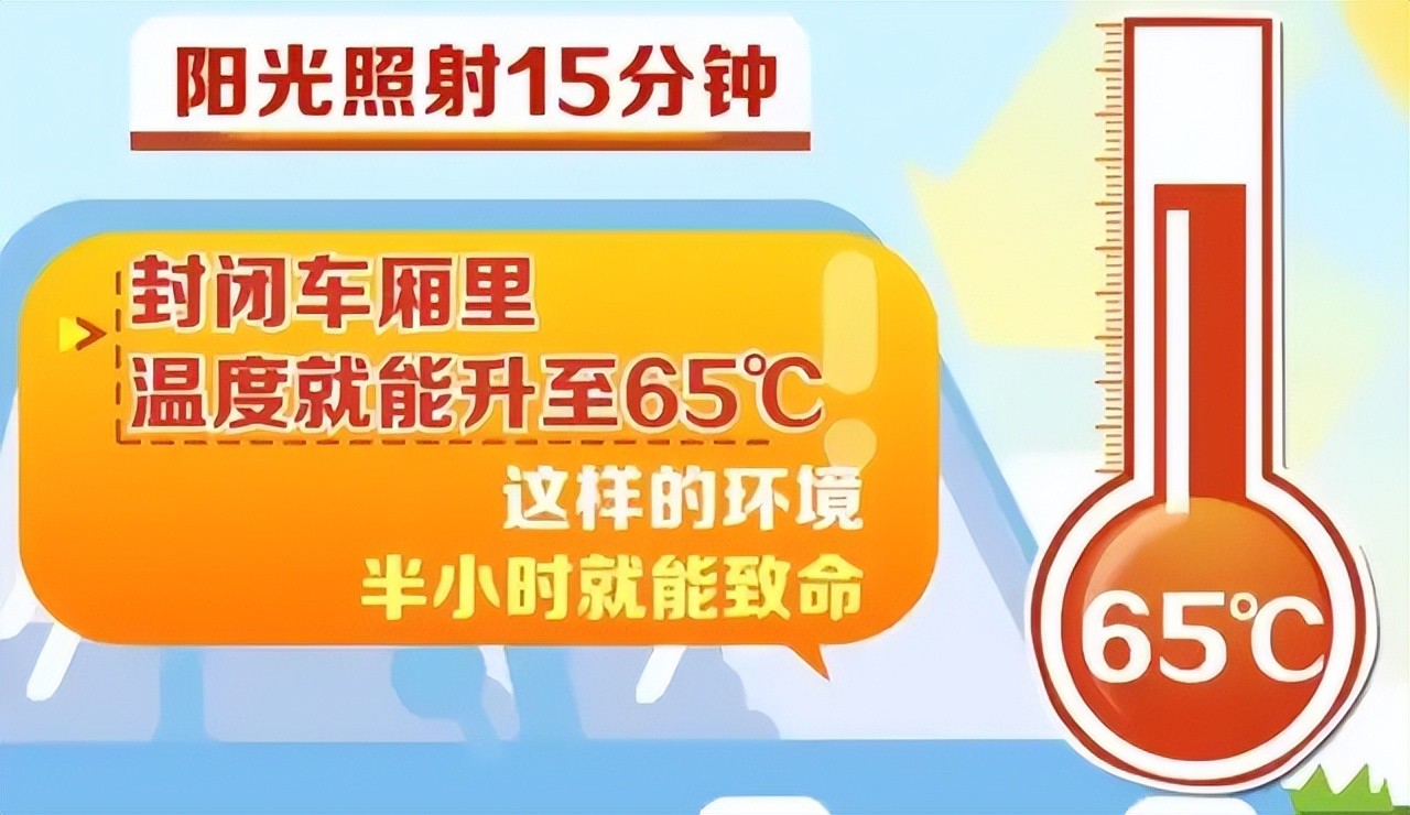 当外界气温达到35摄氏度时,阳光照射15分钟,封闭车厢里的温度就能升至65摄氏度,在这样的环境里待上半小时就可能致命。