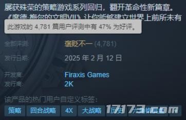 因为卡顿、闪退、UI设计反人性、AI仇恨数值有误等一系列问题,使得《文明7》给绝大部分用户都带来了极其糟糕的游戏体验,其好评率也是一度低至47%。