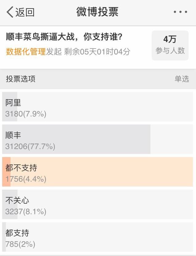 网友一边倒地支持顺丰:截至6月3日晚9时许,微博上一项已有4万人参与的投票,接近80%的网友支持顺丰。