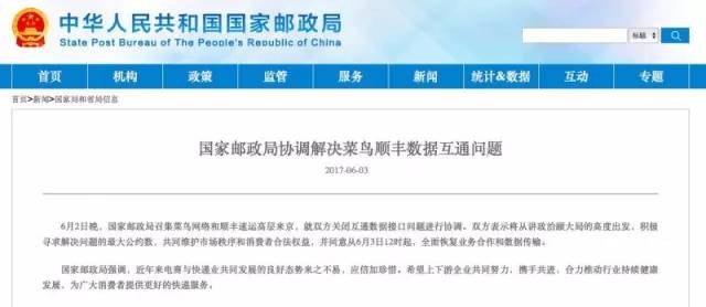 ● 6月1日,国家邮政局即表示,对此事高度重视,切实维护市场秩序和消费者合法权益,决不能因企业间的纠纷产生严重的社会影响和负面效应。