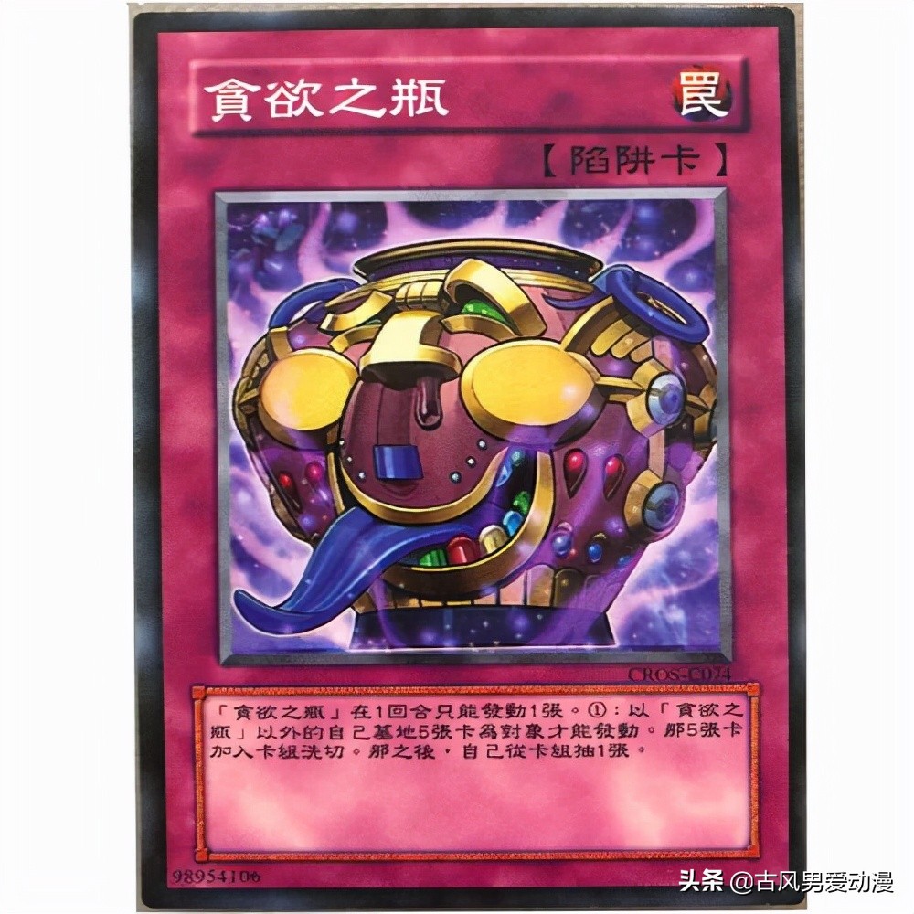 贪欲之瓶大概是贪之壶的亲兄弟,伸出的舌头,满口的彩牙,甚至流出的鼻涕。虽然这张卡不如贪欲之壶的抽两张卡效果好,但取消了墓地卡种是限制卡,针对依赖牌组的卡组是不错的卡。