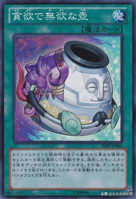 强欲之壶和贪欲之壶的结合体,如果从体积及形态更接近强欲之壶,所以小编怀疑贪欲之壶是不是被绑架了?之前回到卡组的效果变成了从卡组除外,抽两张卡的效果却依旧不变。