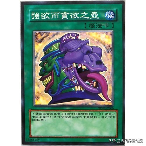 强欲之壶基本上是人人皆知的卡片,在动画中必定人手一张,在困境的时候能很好的补充手卡带来奇迹。整体形象是一个长相极其猥琐,一口大黄牙的壶的形象,也就是这样的形象,能让人感觉到无休止的欲望。