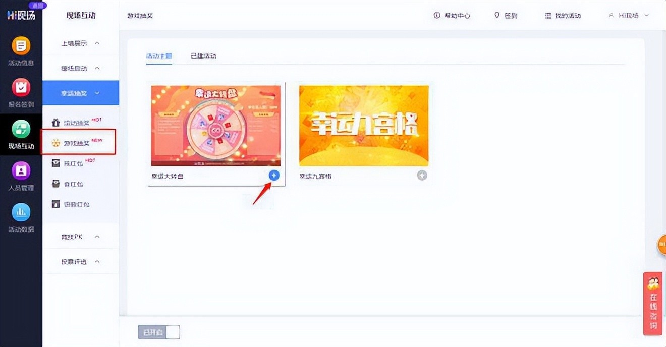 在此,要推荐和介绍的就是制作幸运大转盘抽奖游戏的第三方活动工具——Hi现场。Hi现场是一款精准、高效、点对点的活动运营管理工具,是一款提供给商家运营者使用的免费产品。使用Hi现场制作幸运大转盘活动,十分的简单快捷,只需要通过在官网直接注册账号,并直接登录到Hi现场后台即可免费创建大转盘抽奖游戏。而且在Hi现场的后台,可以选择上传自由活动资源,也可以选择使用麦穗购买Hi现场后台提供的活动资源,而且还有不同的活动形式模板以供选择,让企业商家可以制作不同的抽奖游戏来吸引更多的新用户。