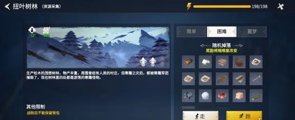 在制作完铜矛之后,我们就该面对第三幕最后的目的地——扭叶树林-困难了。出发之前记得检查背包是否有足够的空位,虽然我们的目的是讨伐boss,但也不能放过扭叶树林中的大量松木,带上斧子、药汤和检查装备的保暖值是否够12点。BOSS会有一些蓄力攻击,看到地上出现范围提示马上跑位躲闪,不要贪刀即可通过。