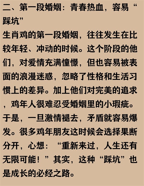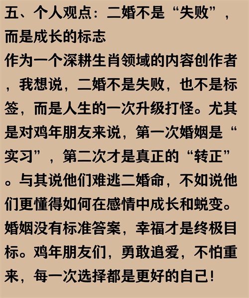 正文内容均有真实数据来源作为参考:根据《2022中国婚姻家庭调查报告》数据显示,属鸡的人在婚姻中因为性格直率、追求完美,导致第一段婚姻中沟通摩擦较多,离婚率略高于平均水平,尤其是在30-40岁之间达到高峰。不过,二婚后大部分属鸡的人能吸取教训,更懂得包容和珍惜,婚姻幸福感提升明显。其实,感情路上多点成长和理解,幸福未必只能靠“二婚”来实现。数据来源:中国社会科学院社会学研究所《2022中国婚姻家庭调查报告》。